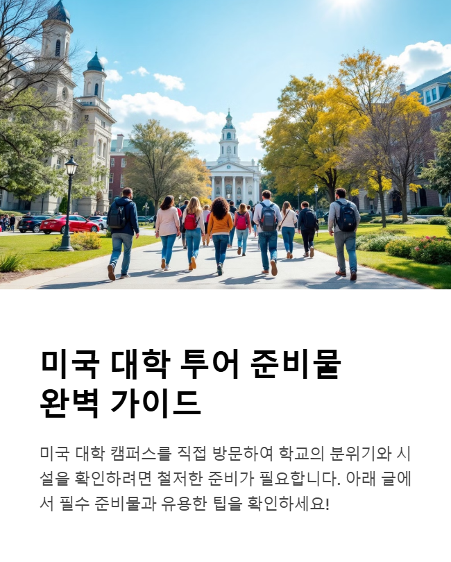 미국 대학 투어 준비물 완벽 가이드미국 대학 투어를 계획하고 있다면 철저한 준비가 필요합니다. 대학 캠퍼스를 직접 방문하면서 학교의 분위기, 시설, 교수진 등을 확인할 수 있기 때문에 철저한 준비가 중요한데요. 이번 글에서는 미국 대학 투어를 위한 필수 준비물과 유용한 팁을 소개하겠습니다.📌 목차여권 및 비자 준비대학별 방문 일정 및 예약 확인필수 문서 및 학업 관련 자료전자기기 및 필수 앱편안한 옷차림과 날씨 대비 용품기타 유용한 준비물추천 온라인 리소스 (무료 & 유료)함께 보면 도움이 되는 영상결론 및 요약 표자동 생성 해시태그1. 여권 및 비자 준비미국 대학 투어를 위해서는 반드시 유효한 여권과 비자가 필요합니다.여권 유효 기간이 충분한지 확인하세요 (최소 6개월 이상)방문 목적에 맞는 **미국..