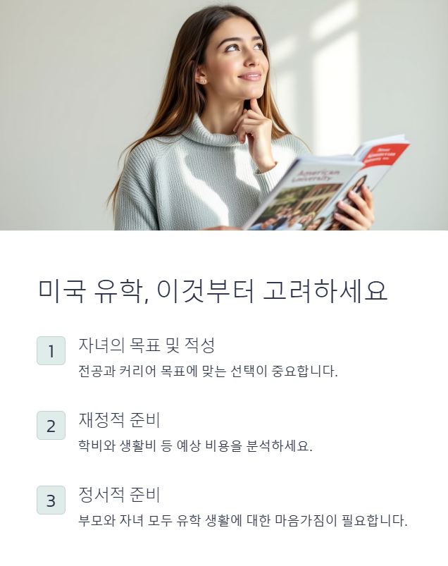학부모를 위한 미국 유학 준비 가이드자녀의 미국 유학을 준비하는 과정은 설레면서도 많은 고민이 따르는 중요한 결정입니다. 학업, 재정, 정서적 지원 등 여러 측면에서 철저한 준비가 필요합니다. 이 글에서는 학부모가 자녀의 미국 유학을 체계적으로 준비할 수 있도록 단계별 가이드를 제공합니다.📌 목차미국 유학을 고려해야 할 주요 요소대학 및 프로그램 선택 방법입학 준비 과정 (시험 및 서류 준비)재정 계획 및 학비 마련 방법비자 신청 및 법적 절차숙소 및 생활 환경 준비건강 및 보험 준비출국 전 필수 체크리스트추천 온라인 리소스 (무료 & 유료)함께 보면 도움이 되는 영상결론 및 요약 표자동 생성 해시태그1. 미국 유학을 고려해야 할 주요 요소미국 유학을 고려할 때 가장 중요한 요소는 다음과 같습니다.자녀..