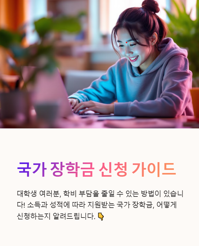국가 장학금 신청 방법 및 필수 정보국가 장학금은 대한민국 정부가 대학생들의 학비 부담을 줄이기 위해 지원하는 대표적인 장학금 제도입니다. 소득 수준과 성적 기준에 따라 차등 지급되며, 신청 방법과 절차를 정확히 이해하는 것이 중요합니다. 이번 가이드에서는 국가 장학금 신청 방법, 지원 대상, 신청 기간 및 주요 유의사항을 정리하였습니다.📌 목차국가 장학금 개요지원 대상 및 신청 자격국가 장학금 신청 기간신청 방법 및 절차국가 장학금 지급 기준주의사항 및 자주 묻는 질문결론 및 요약자동 생성 해시태그1. 국가 장학금 개요국가 장학금은 한국장학재단에서 운영하며, 대학 등록금 부담을 덜어주기 위해 지원됩니다. 장학금 유형은 크게 1유형(소득 연계형), 2유형(대학 연계형), 다자녀 장학금, 지역 인재 장학..