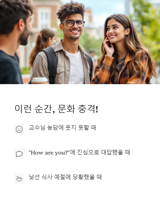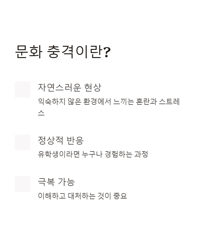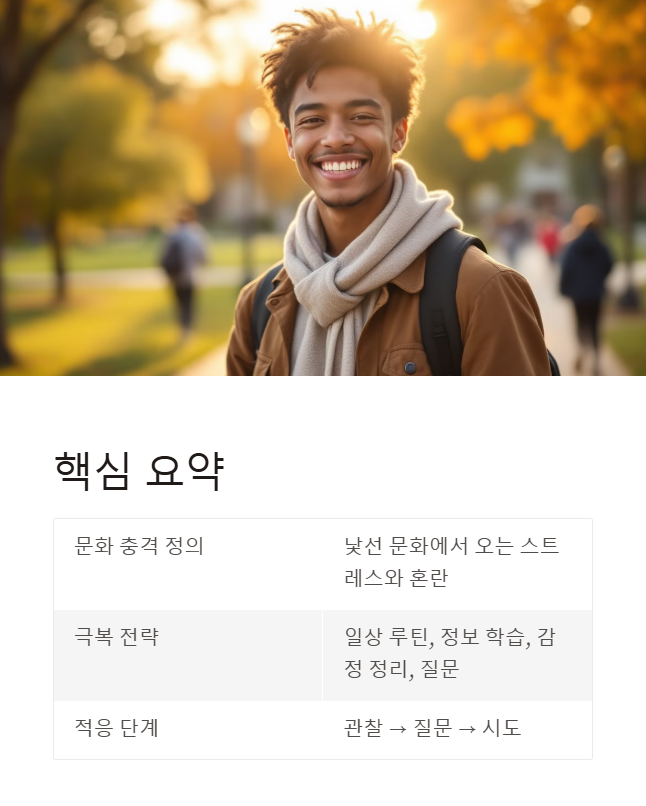 문화 충격(Culture Shock)은 익숙하지 않은 환경에 놓였을 때 느끼는 혼란, 스트레스, 소외감 등을 말합니다. 유학생이라면 누구나 한 번쯤은 겪게 되는 자연스러운 현상이죠.