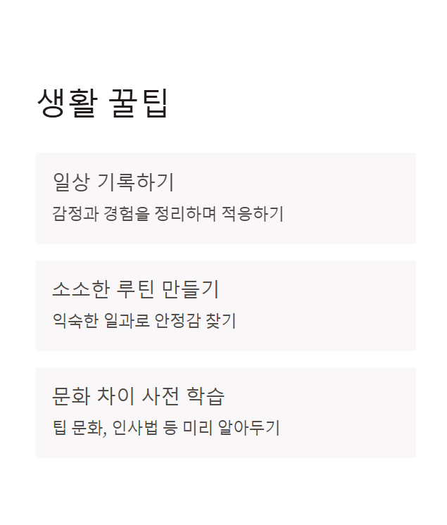| ✅ 일상 기록하기 | 낯선 환경에서 감정과 경험을 기록하면 감정 정리에 도움이 됩니다. |
