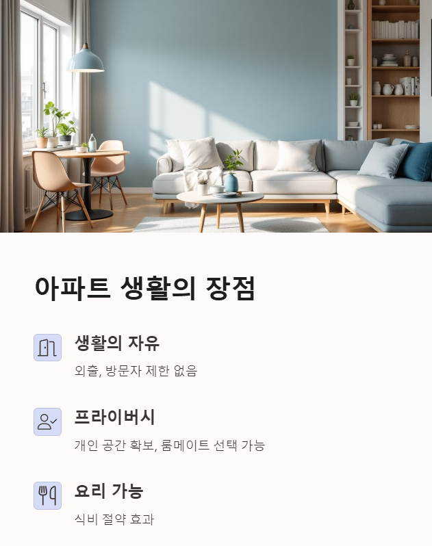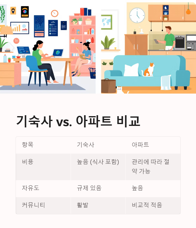 | 비용 및 시설 | 기숙사는 식사 포함, 아파트는 직접 관리 필요 |