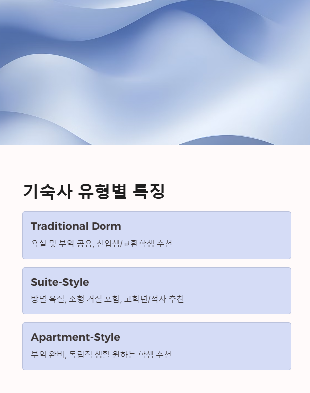 | Apartment-Style Dorm | 부엌 완비, 자취 가능 | 독립적 생활 원하는 유학생 |