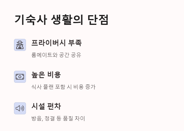 - 프라이버시 부족 (룸메이트와 공유)