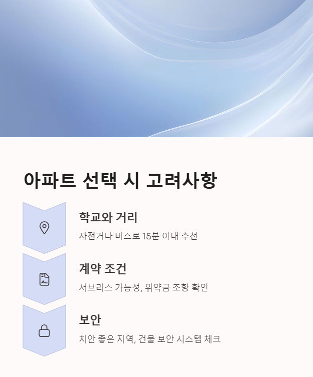 | 계약 방식 | 기숙사는 단기 계약, 아파트는 장기 계약 유리 |