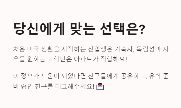 | 기숙사 추천 대상 | 처음 미국 생활을 시작하는 신입 유학생 |