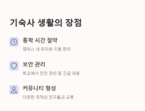 특히 신입생이나 교환학생에게는 생활 적응, 안전성, 커뮤니티 형성 측면에서 유리합니다.