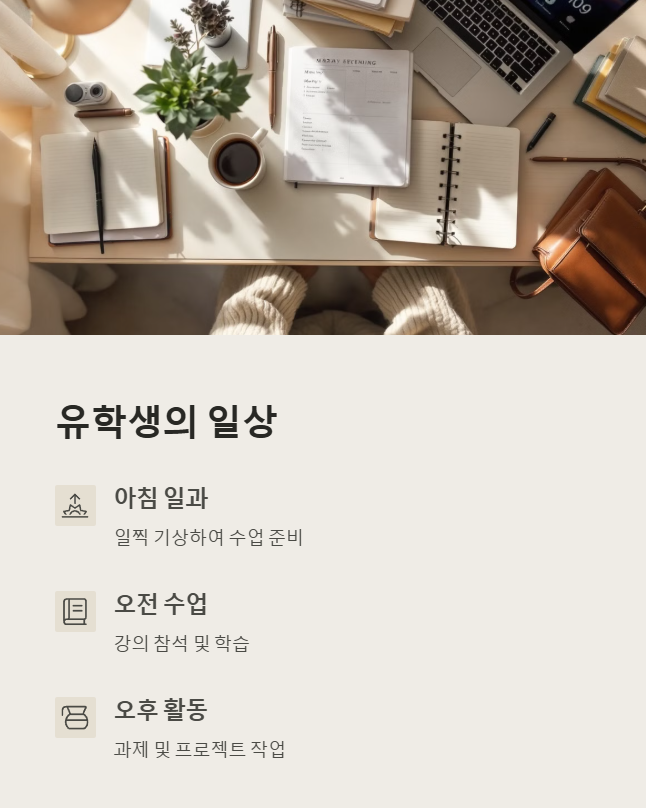 기숙사나 외부 렌트 하우스에서 생활하는 학생들은 아침 식사 준비부터 교통편 체크까지 자기 주도적인 생활을 하게 됩니다. 수업 시작 시간에 맞춰 아침을 간단히 해결하고, 버스나 자전거로 캠퍼스로 이동하는 것이 일반적입니다.
