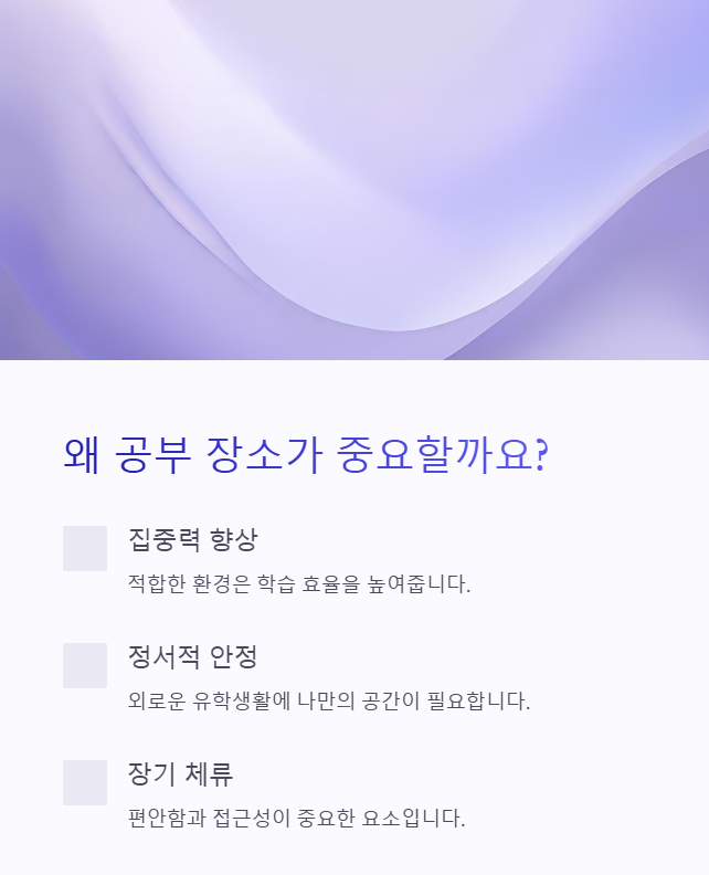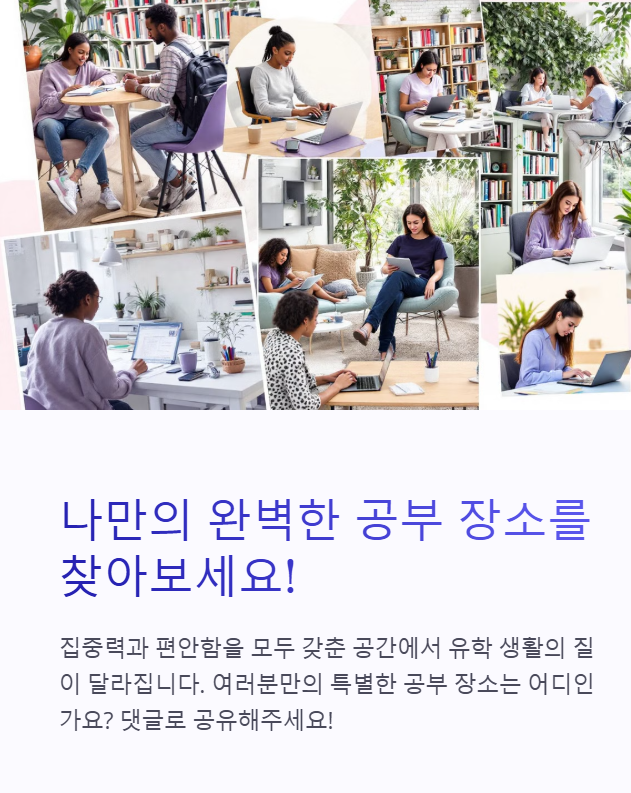 유학생활에서 공부는 가장 중요한 일과 중 하나지만, 집중할 수 있는 환경을 찾는 것부터 큰 과제입니다.