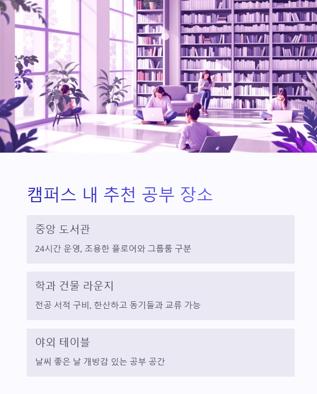 많은 학교에서는 도서관 예약 시스템이나 **조용한 존(Silent Zone)**을 운영하고 있으니 사전 확인이 필요합니다.