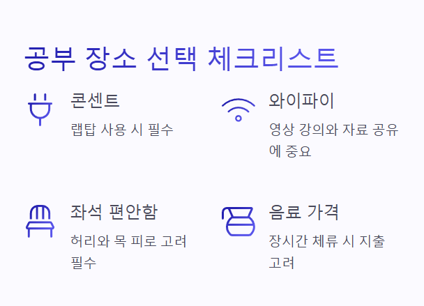 | 장소 선택 팁 | 와이파이, 콘센트, 좌석 편안함, 소음 여부 고려 |