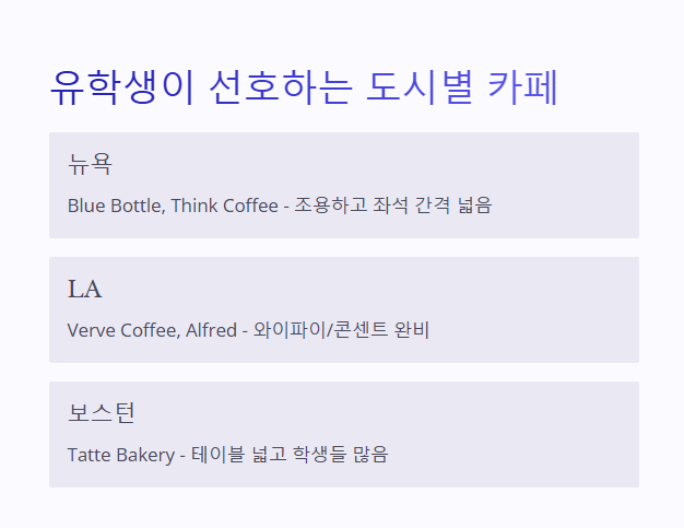 | 보스턴 | Tatte Bakery, Pavement Coffee | 테이블 넓고, 주변 MIT/하버드 학생 많음 |