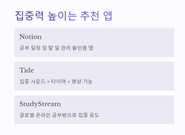 | Tide | 집중 사운드 + 타이머 + 명상 기능 통합 |