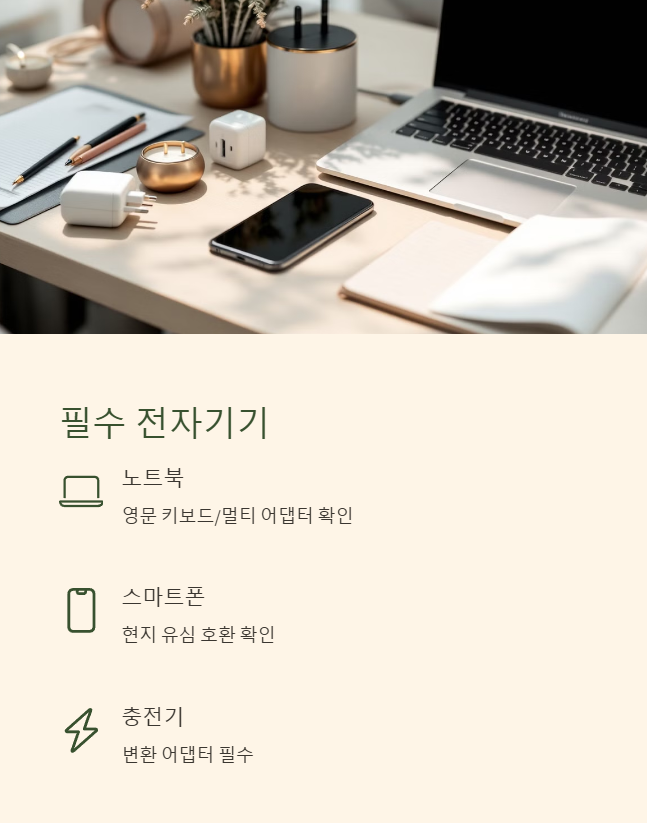 학업에 필요한 전자기기는 필수입니다. 현지에서 구입할 수도 있지만, 익숙한 기기를 사용하는 것이 더 효율적이에요.