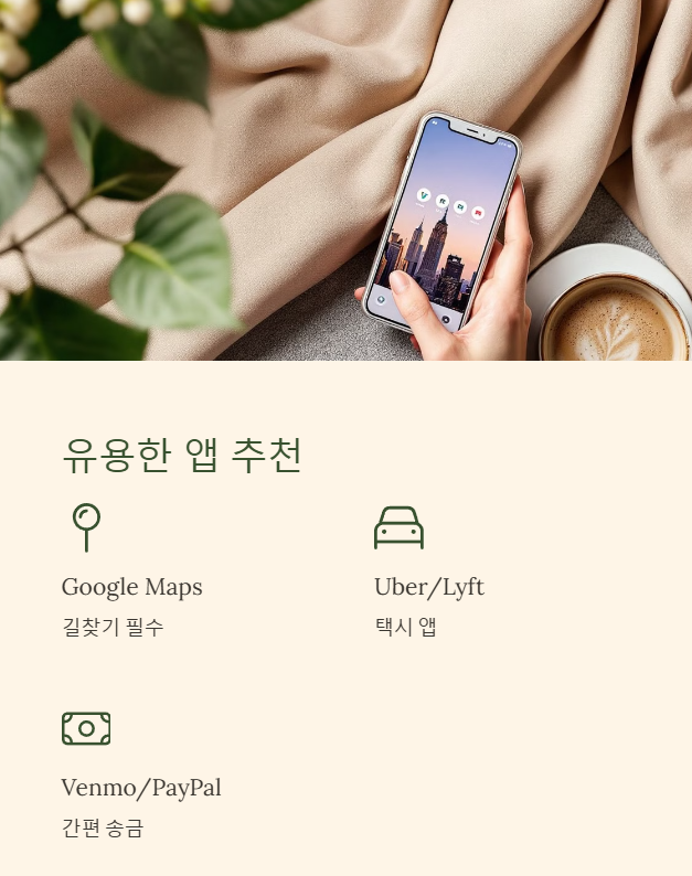 | 유용한 앱 | Google Maps, Venmo, Amazon 등 |