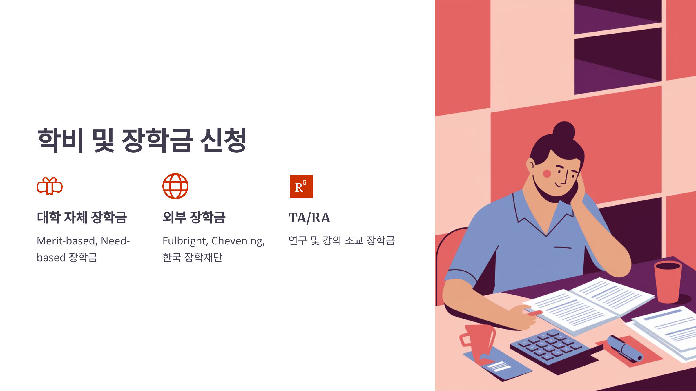 - 외부 장학금: Fulbright, Chevening, 한국 장학재단 지원금 등