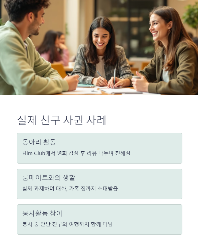 다양한 유학생 커뮤니티에서 실제로 많이 언급되는 “친구 사귀기 성공 사례”들을 소개합니다.