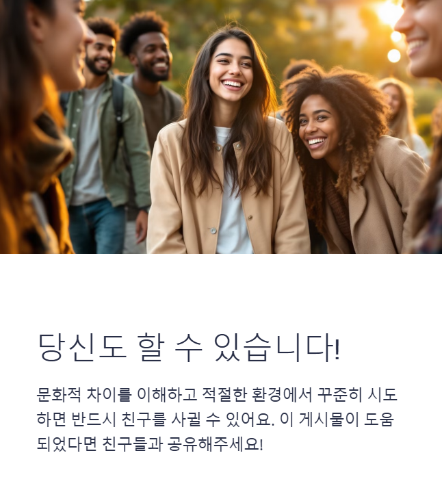 미국 친구들은 다양한 문화 배경을 존중하는 문화에 익숙하므로, 솔직하게 자신의 경험을 공유하면 의외로 공감해주는 경우도 많습니다.
