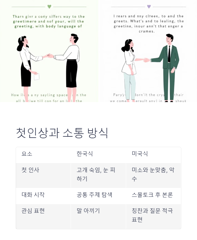 | 첫 인사 | 고개 숙임, 눈 피하기 | 미소와 눈맞춤, 손 흔들기 또는 악수 |