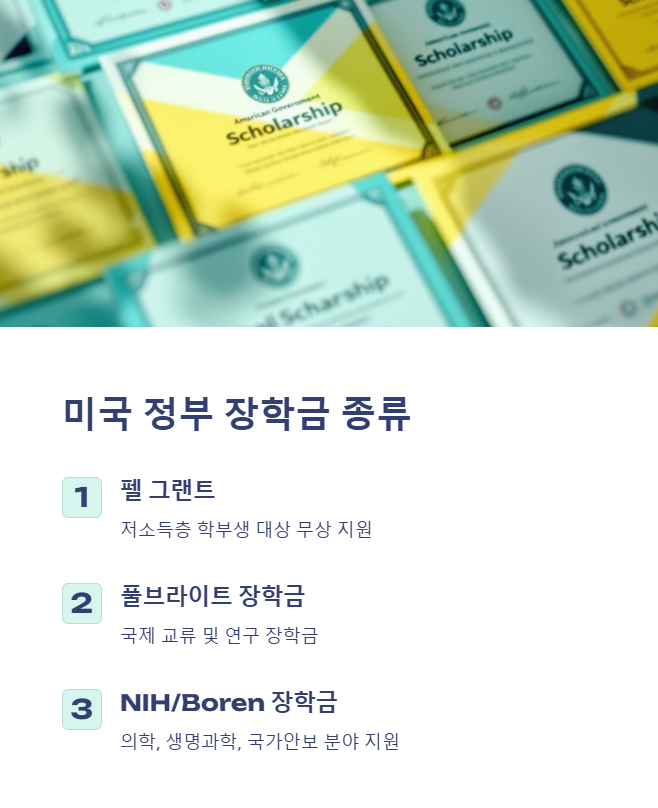 장학금 유형 | Pell Grant, Fulbright, NIH 등 |