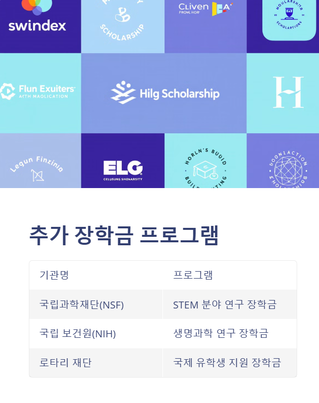 - NIH 장학금, Boren 장학금 등은 특정 연구 분야(의학, 외국어 등)에 집중한 학생들에게 제공됩니다.