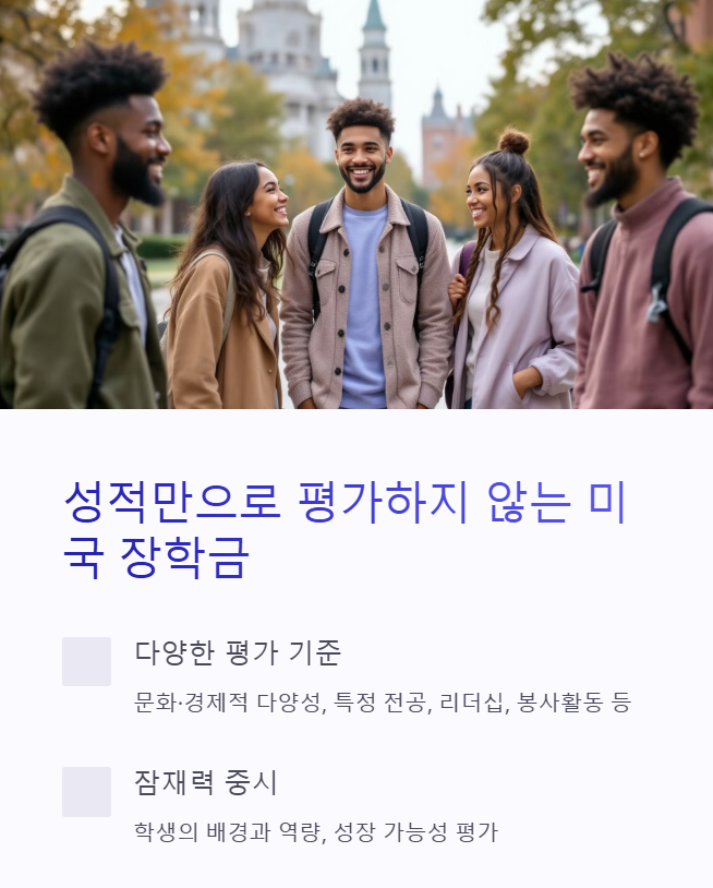 미국의 많은 장학금은 성적 외에도 다양한 배경과 역량, 잠재력을 기준으로 학생을 평가합니다.