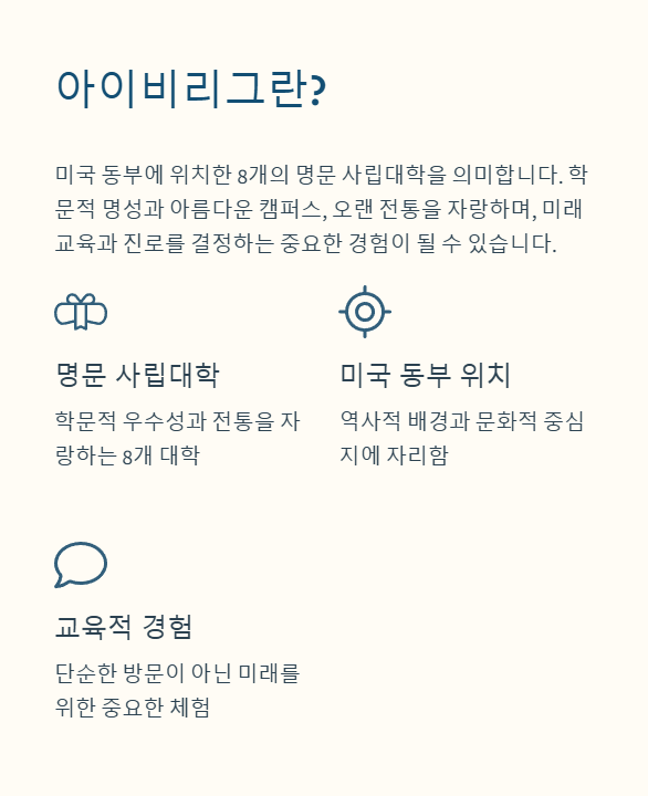아이비리그(Ivy League)는 미국 동부에 위치한 8개의 명문 사립대학을 의미합니다. 학문적 명성과 함께 아름다운 캠퍼스와 전통을 자랑하며, 많은 학생과 학부모들이 직접 방문하여 그 분위기를 체험하고자 합니다. 아이비리그 투어는 단순한 캠퍼스 방문이 아니라, 미래의 교육과 진로를 결정하는 중요한 경험이 될 수 있습니다.