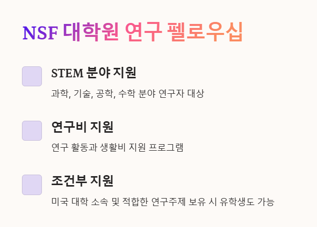 - 설명: STEM 분야 석·박사 과정 지원자에게 연구비 및 생활비 지급 (유학생도 일부 조건하에 가능)
