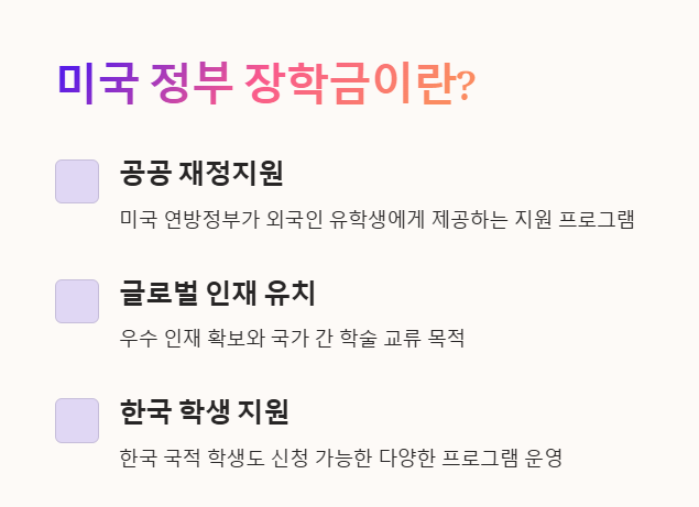 미국 유학을 준비하는 학생들에게 가장 큰 걱정은 높은 학비와 생활비 부담입니다. 하지만 다행히도 미국 정부는 전 세계 유학생을 대상으로 한 다양한 장학금 제도를 운영하고 있으며, 이 중 일부는 공공기관이나 정부 예산으로 운용되는 프로그램입니다.