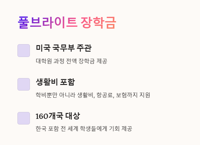 - 설명: 미국 대학원 과정(석사/박사) 진학 시 전액 장학금 + 생활비, 항공료, 보험 지원