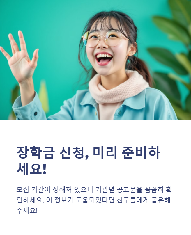 장학금 신청은 미리 준비해야 하며, 모집 기간이 정해져 있으므로 기관별 공고문을 꼼꼼히 확인하는 것이 중요합니다. 다양한 기회를 놓치지 않고 활용하세요! 😊