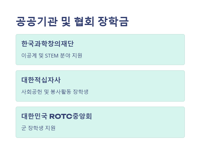 다양한 공공기관과 협회에서도 특정 분야 학생을 위한 장학금을 운영합니다.